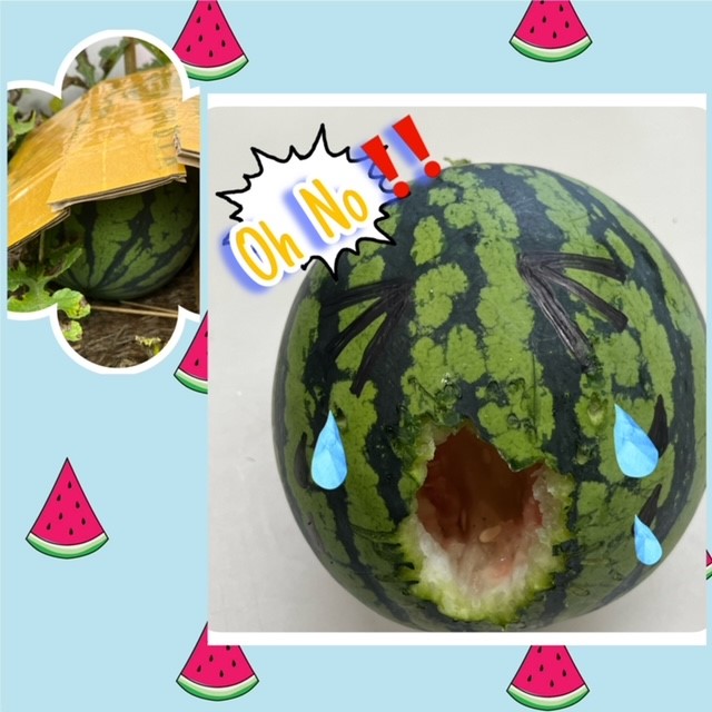 雨の中、スイカを守る為、段ボールをかけてみました、、、